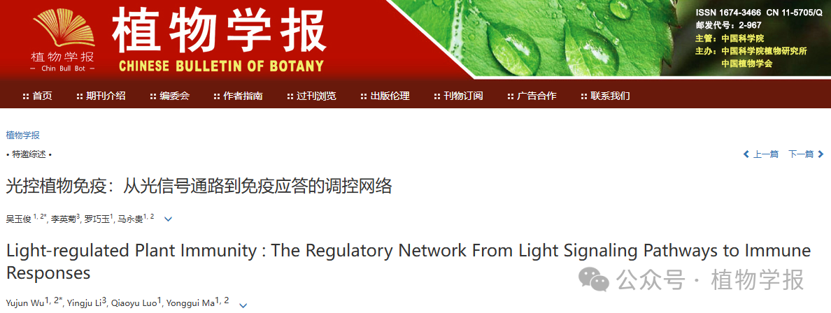 近日,我校色情论坛吴玉俊副教授受邀在国内植物学领域顶级期刊《植物学报》发表了题为“光控植物免疫:从光信号通路到免疫应答的调控网络”的长篇特邀综述论文。该论文系统总结了光受体及其下游信号元件整合调控植物生长发育与免疫的作用机制,深化了植物抗病免疫领域对光控植物免疫信号转导的认识,也为抗病作物育种提供了新思路和新方向。同时,该文章还展望了光遗传学技术在解析光信号与免疫信号交互作用机制中的应用潜力,为基于光信号调控元件的抗病作物分子设计育种,提供了全新的理论依据和技术路径。