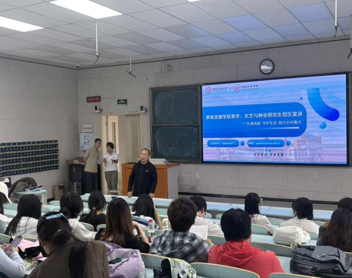 在宣讲环节,西南民族大学草地资源学院关皓老师和张俊超老师从多个维度系统介绍了该院办学情况。内容涵盖学院发展历程、学科布局与特色优势,尤其在草学、生态学等方向的研究积累和教学资源。他们还重点展示了草种质资源创新、草地生态修复等领域的显著成果,并结合行业发展趋势与人才需求,为同学们描绘出清晰的学术路径与职业前景。
