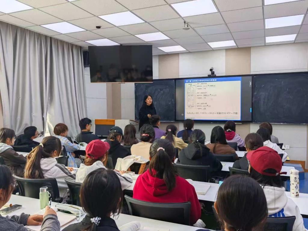 张国燕老师在《人体及动物生理学》课堂上,针对“肌细胞的收缩功能”这一抽象章节,以“神经肌肉接头处的信号传递”为核心,通过3D动画演示电信号传递过程,结合离子通道相关内容将抽象的生理机制转化为直观认知,引导学生结合已学知识分析信号在不同组织之间的传导,有效突破教学重难点,课堂互动氛围活跃。陈海娟老师则在《无机及分析化学》课程中,围绕“化学热力学和化学动力学基础”,采用“概念拆解+公式推导+案例应用”的递进式教学模式,将生物学现象融入化学反应的原理,帮助学生建立化学理论与生物学实际应用的联系,提升知识理解深度。