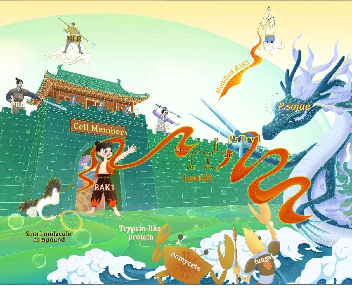 植物病害是导致作物减产和品质下降的主要元凶之一,已对全球粮食安全构成了严重威胁。因此,解析植物与病原微生物之间的博弈机制,对保障全球粮食安全具有重要的现实意义。在这场持续了数百万年的军备竞赛中,植物细胞壁与细胞膜之间的质外体空间,成为了植物与病原微生物交锋的前线阵地。在这里,植物细胞膜上的模式识别受体(PRRs)如同警惕的哨兵,通过识别病原微生物的保守分子特征,而启动植物的第一层免疫防线,即模式触发免疫(PTI)。但是,病原微生物为了突破这道免疫防线,演化出了多种分泌到细胞内的蛋白效应子,其可在宿主细胞内通过直接攻击PRRs或其共受体BAK1而抑制免疫信号的激活。然而,病原菌能否在质外体空间直接攻击PRRs或其共受体BAK1,从而在源头上阻断植物免疫信号的传递链,在此之前还未见相关报道。
